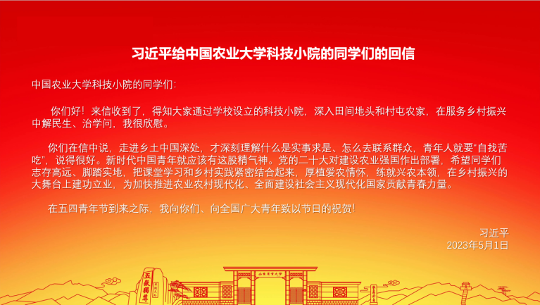 中国青年五四奖章集体成员、农学院作物遗传育种博士郝永超谈到,习近平总书记的回信指引我们要将课堂学习与乡村实践紧密结合,为乡村振兴贡献青春力量。近日,学校与德州市人民政府共建小麦产业研究院,聚力打造中国特色、世界一流新型研发机构,努力建设成为国际一流的小麦产业创新中心和人才高地,助推农业产业高质量发展。总书记的回信为全心投入研究院建设的师生团队注入了一针强心剂。作为小麦遗传育种研究生,我将以总书记的回信为动力,发挥作物学专业特长,聚焦国家粮食安全,围绕小麦种质资源创新、新品种选育开展深入研究,关注农民生活状况,关注农村产业发展,关注农业发展未来,学会“自找苦吃”,勇于担当,到田间地头去,到农民群众中去,发现问题,解决问题,厚植爱农情怀,练就兴农本领,在守护国家粮食安全中绘就最美丽的“青春篇章”。