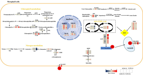 该研究发现镉胁迫下NC55中NtNRAMP5基因的表达量显著高于K326,导致NC55叶片中积累了更多的镉。同时,NtNRAMP3a,NtNRAMP3b和NtNRAMP6在NC55中的高表达增加了NC55对镉的敏感性。另外,镉胁迫下K326中POD活性较高,ROS和MDA积累量较低,ABA含量较高,耐镉相关转录因子(WRKY、MYB、NAC、bHLH)表达量较高,提高了K326对镉的耐受性。导致K326根系和叶片超微结构受镉损伤程度均低于NC55,氮代谢和光合作用速率均高于NC55。最终导致镉胁迫下K326生物量显著高于NC55。这项研究阐明了烟草叶片镉积累和镉耐受性的机理,为培育低镉积累、高镉耐受性烟草品种奠定了理论基础。