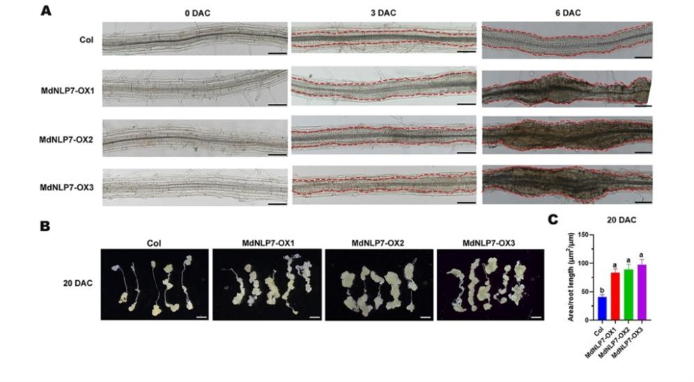在本研究中,将苹果MdNLP7转录因子在拟南芥中异位表达,发现MdNLP7蛋白可以调控以根为外植体的植物再生;进一步的研究结果表明,MdNLP7介导了中柱鞘细胞分裂的起始。在愈伤组织形成的过程中,MdNLP7可以上调生长素合成和转运相关基因的表达,并通过影响生长素的分布来实现对根外植体愈伤形成过程的调控,进而调控硝酸盐介导的根外植体再生。