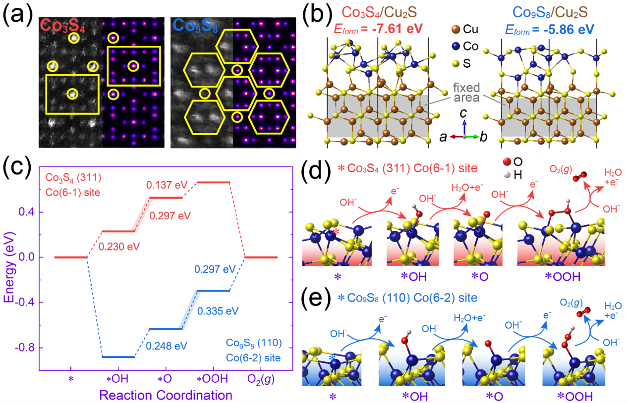 论文提出了一种光热协同界面相变促进高效电催化水分解的新策略,创新性地融合了界面相变和光热效应,开发了一种多重异质Co9S8/Co3S4/Cu2S纳米颗粒作为析氧反应(OER)电催化材料,其中Co3S4在Co9S8和Cu2S之间的界面上生长。理论计算表明,将Co9S8和Cu2S整合在一起会触发Co9S8的界面相变,从而导致界面Co3S4层的形成,这是因为Co3S4/Cu2S(-7.61 eV)的形成能比Co9S8/Cu2S(-5.76 eV)低。这种相变不仅降低了OER的能垒(从0.335 eV降低到0.297 eV),还引发了界面电荷的重新分布,增加了载流子密度(从7.76×1014cm-3增加到2.09×1015cm-3),并创造了更多的活性位点。