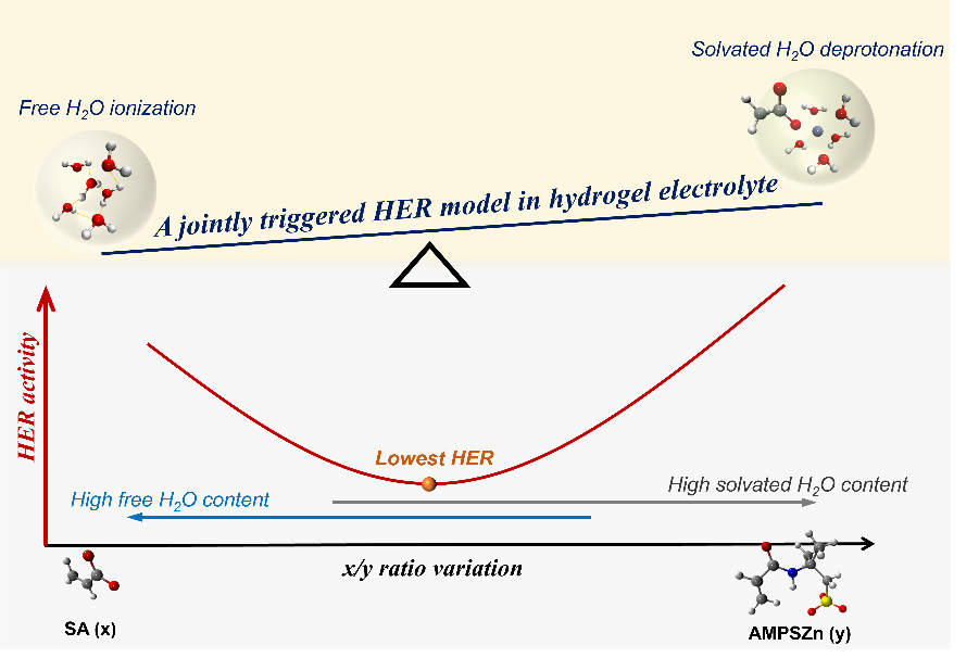 水凝胶是一类高粘度、高弹性的非均质软材料,具有结构可调性、功能拓展性、粘附能力以及稳定性,在储能、医药、环境等领域展现出独特的性能优势和应用潜力。近日,针对水凝胶电解质中存在的析氢反应(HER)显著降低体系电化学稳定性且不同析氢阶段的主导因素尚不清楚问题,22级硕士研究生秦硕在胡媛媛副教授、杨凯教授指导下利用不同阴离子基团氢键受体位点数差异,提出一种混合阴离子梯度调节策略,揭示了Zn2+溶剂化水去质子化和自由水电离共同触发的HER模型。结合实验表征和理论计算,证实了溶剂化水和自由水分别是决定HER起始电位和析氢强度的关键变量。通过凝胶骨架阴离子调节可以削弱起始电位和析氢强度,实现更好的HER抑制效果。此外,阴离子加速的Zn2+脱溶动力学和优化的凝胶-负极界面,显著增强了Zn的化学可逆性。作为概念验证,Zn/PAHE/LFP电池表现出优异的容量保持率、倍率性能、长循环寿命(>10000次循环)和宽温度适应性(-20-60 oC)。该研究为先进水凝胶电解质的开发提供了重要指导,并推动了高稳定性水系锌金属电池的实用化进程。