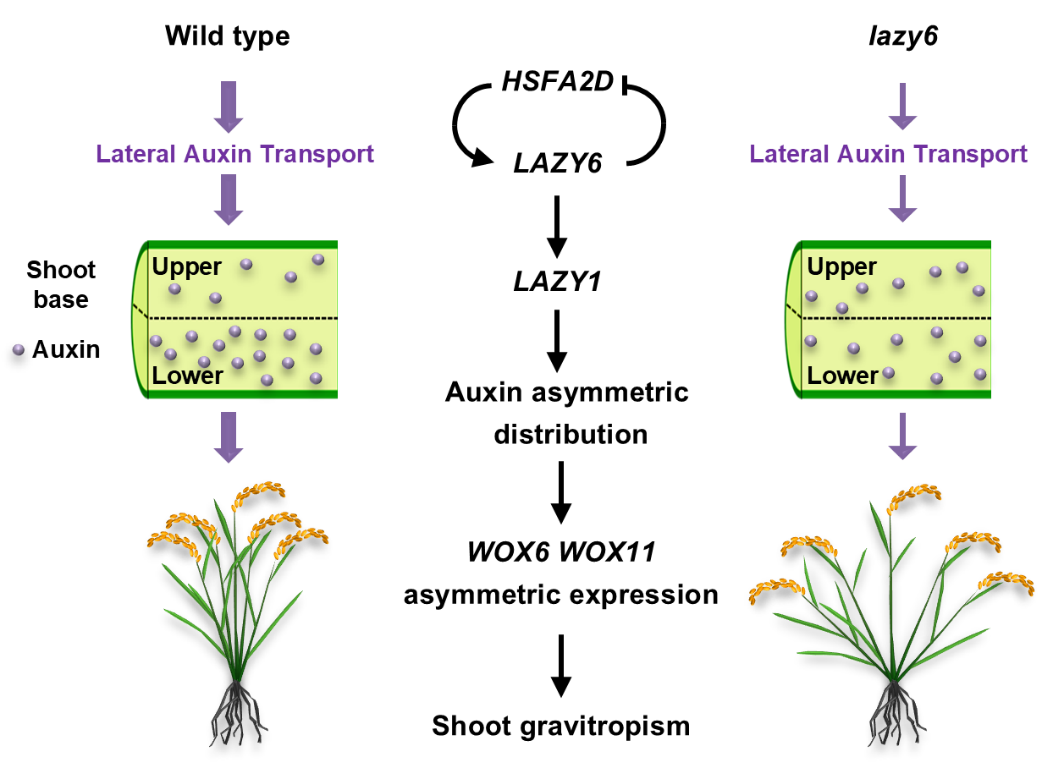 分蘖角度是作物株型的重要组成部分,对作物种植密度、群体光合效率以及最终产量具有重要影响。水稻分蘖角度的形成与重力反应密切相关。解析其背后的分子调控机制,不仅有助于揭示植物感知和响应重力的基本生物学过程,更对提高水稻群体产量具有指导意义。王永红教授团队长期致力于水稻株型研究,围绕重力反应调控的水稻分蘖角度系统开展研究,揭示了以HSFA2D-LA1-WOX6/11为核心的水稻分蘖角度遗传调控途径。近日,该团队与中文字幕有码无码人妻aV蜜桃_亚洲中文在线看视频一区_91精品国产综合久久香蕉蜜桃_欧美日韩最新一区二区三区_99久久精品无码一区二区久久__亚洲国产日韩制服在线观看_日韩AV片无码一区二区不卡电影_久久久久久夜精品精品免费啦农学院张宁教授团队合作,在《New Phytologist》发表了题为“HSFA2D-LAZY6—LAZY1 module regulates shoot gravitropism and tiller angle in rice”的研究论文,揭示了LA6作为连接HSFA2D与LA1的关键因子调控水稻分蘖角度的分子机制,进一步完善了水稻分蘖角度的遗传调控网络。