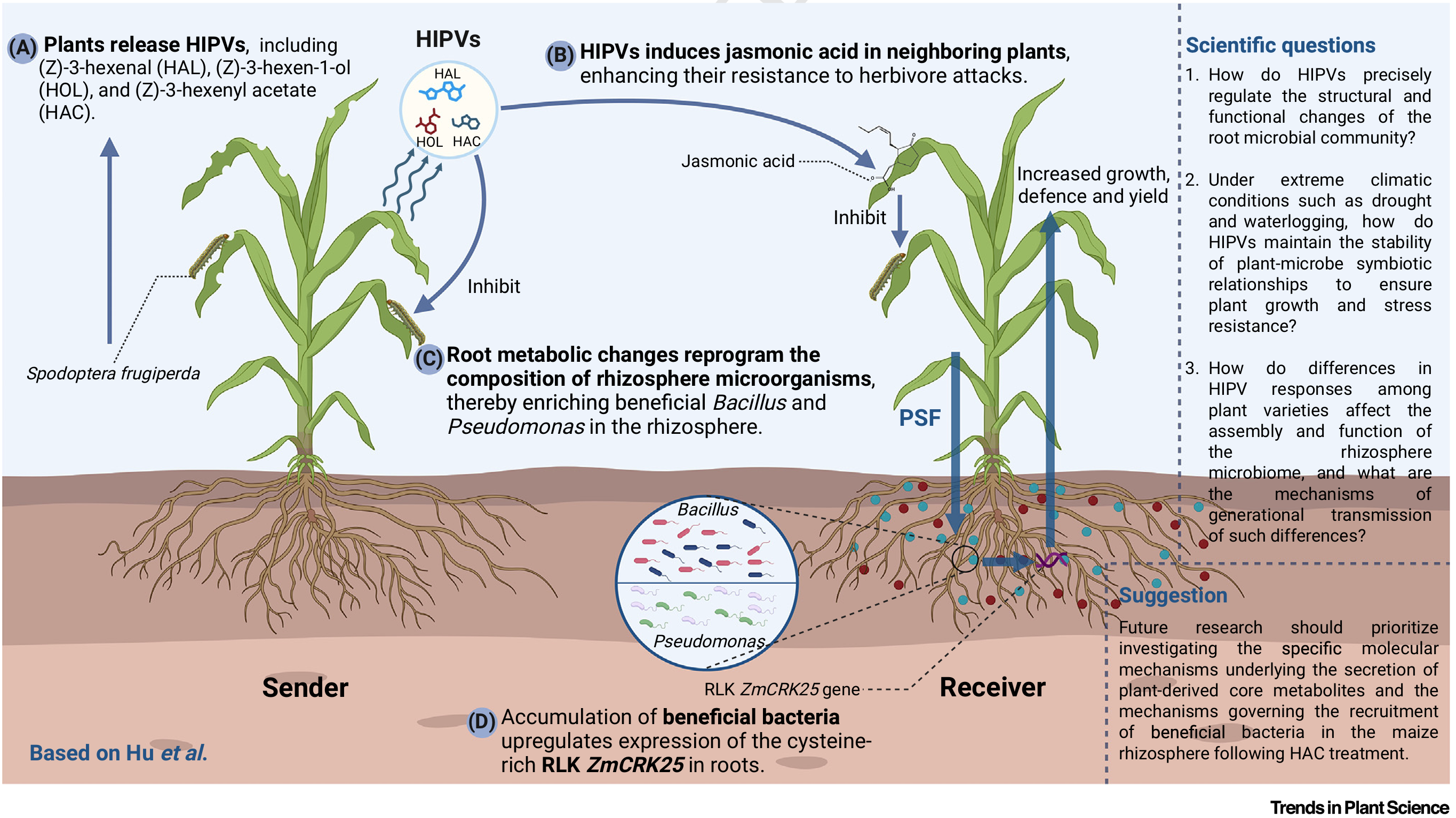 在农业生态系统中,植物-植物及植物-微生物的互作网络是维系作物生长与健康的核心基础。作为关键化学信号媒介,食草动物诱导植物挥发物(HIPVs)在调控上述互作过程中展现出独特机制,已逐步成为提升农业可持续性的前沿研究焦点。值得关注的是,在农业应用场景中实现HIPVs功效与安全性的平衡面临复杂挑战,其作用效果受三大互作变量协同调控:施用剂量与时机、作物遗传背景以及环境条件。此外,应用过程中潜在的生态权衡与非预期效应进一步增加了技术部署的复杂性:如通过HIPVs选择性富集有益细菌可能伴随丛枝菌根真菌等共生微生物的抑制,进而影响作物磷素吸收与土壤碳固存功能;在携带潜伏病原菌的土壤中,HIPVs可能通过群体感应机制激活微生物毒力基因表达或促进生物膜形成,反而加剧病害风险;长期重复施用HIPVs还可能导致根际微生物群落结构同质化,削弱生态系统对环境胁迫的功能冗余与恢复能力。研究团队认为,HIPVs作为精准调控植物间及植物-微生物互作的创新工具,其理论框架的实践转化需突破三大核心瓶颈:HIPV成分谱的种内/种间差异性、田间尺度挥发物可控释放的技术壁垒、环境背景依赖的动态调控机制。随着全球气候变化加剧及可持续农业需求升级,通过系统解决基因型特异性响应、挥发物精准递送及环境适应性等关键科学问题,将HIPVs研究与农业生态原理深度融合,有望构建“以自然信号驱动生态调控”的现代农业生产范式。