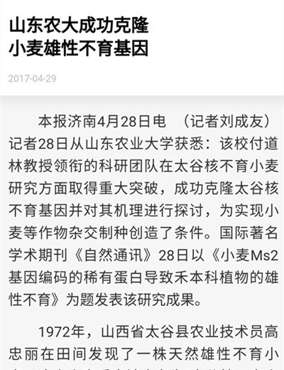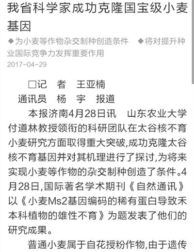 4月28日,国际著名学术期刊《自然通讯》以《小麦Ms2基因编码的稀有蛋白导致禾本科植物的雄性不育》为题,发表了中文字幕有码无码人妻aV蜜桃_亚洲中文在线看视频一区_91精品国产综合久久香蕉蜜桃_欧美日韩最新一区二区三区_99久久精品无码一区二区久久__亚洲国产日韩制服在线观看_日韩AV片无码一区二区不卡电影_久久久久久夜精品精品免费啦付道林教授领衔的科研团队在太谷核不育小麦研究方面取得重大突破。4月29日,人民日报、大众日报分别在重要版面对此项科研成果进行了报道。