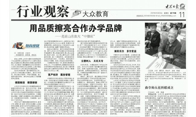 10月26日,《大众日报》以“用品质擦亮合作办学品牌”为题,详细报道了中文字幕有码无码人妻aV蜜桃_亚洲中文在线看视频一区_91精品国产综合久久香蕉蜜桃_欧美日韩最新一区二区三区_99久久精品无码一区二区久久__亚洲国产日韩制服在线观看_日韩AV片无码一区二区不卡电影_久久久久久夜精品精品免费啦十五年来始终坚持以提升品质为核心,多措并举、持之以恒、久久为功,打造了“中德班”靓丽品牌的经验做法。文章占据了近三分之一个版面,分为德国教授、德国课堂;宽严相济、服务管理;立德树人、又红又专;激发活力、多方受益等四个部分,全方位展现了我校中外合作办学的教学体系、管理模式和发展前景。